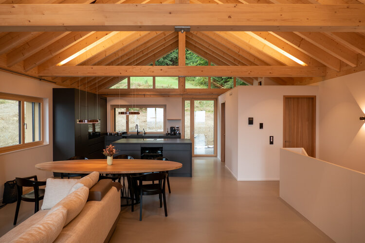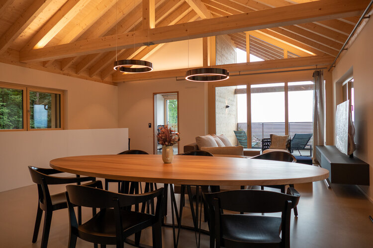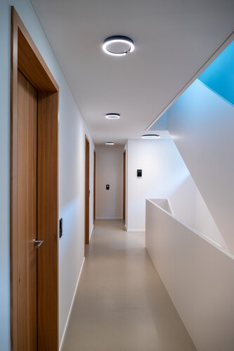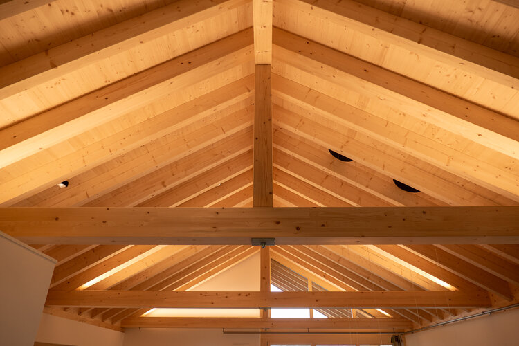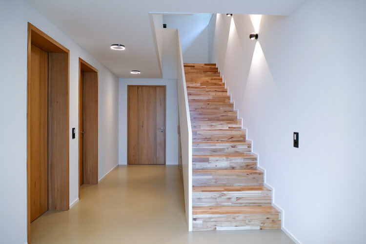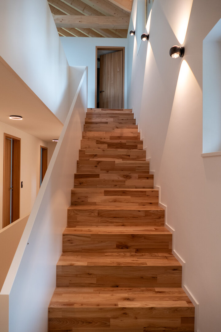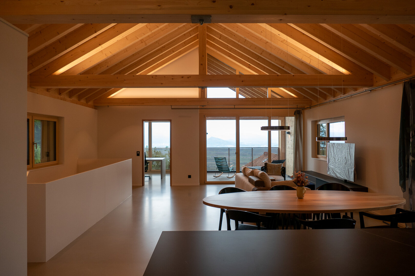 Im untersten Geschoss befindet sich der Zugang ins Haus. Eingang, Garderobe und Treppenhaus, aber auch Garage und Nebenräume befinden sich auf diesem ersten Geschoss. Im zweiten Geschoss sind Schlafzimmer und Nasszellen angeordnet. Im obersten Geschoss folgen alle Tagesräume und ein Büro an bester Aussichtslage. Das Obergeschoss mit offenem Dachraum und sichtbaren Holzbalken bietet ein besonderes räumliches Erlebnis.