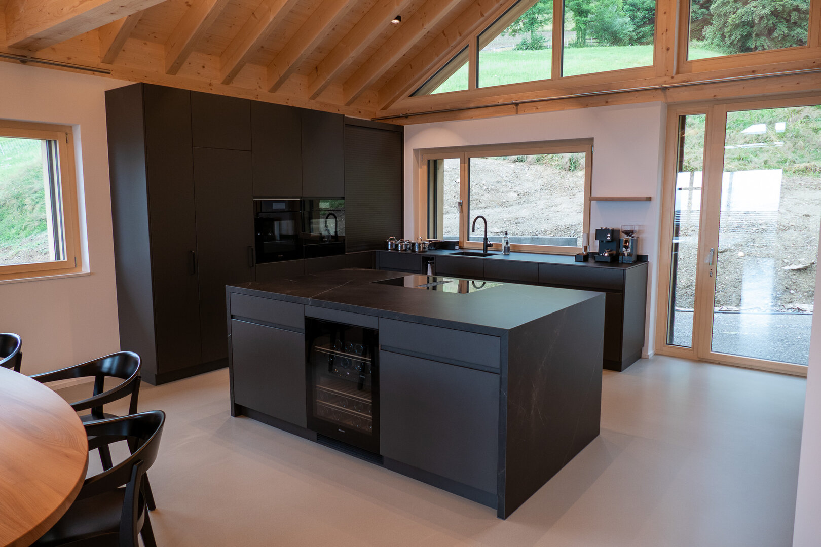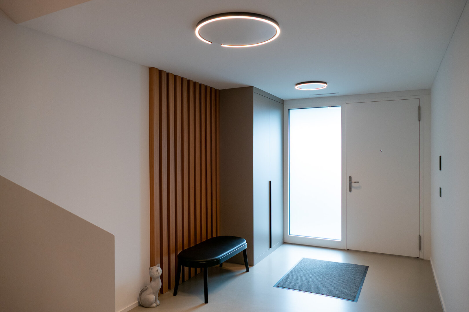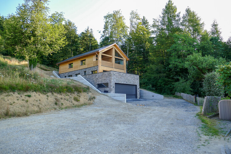 Eine besondere Lage. Am Osthang des unteren Rheintals mit einer schönen Aussicht über das Tal und am kühlen Waldrand gelegen, idyllisch und trotzdem nahe am Puls des Tals, durften wir dieses Einfamilienhaus entwickeln und realisieren.