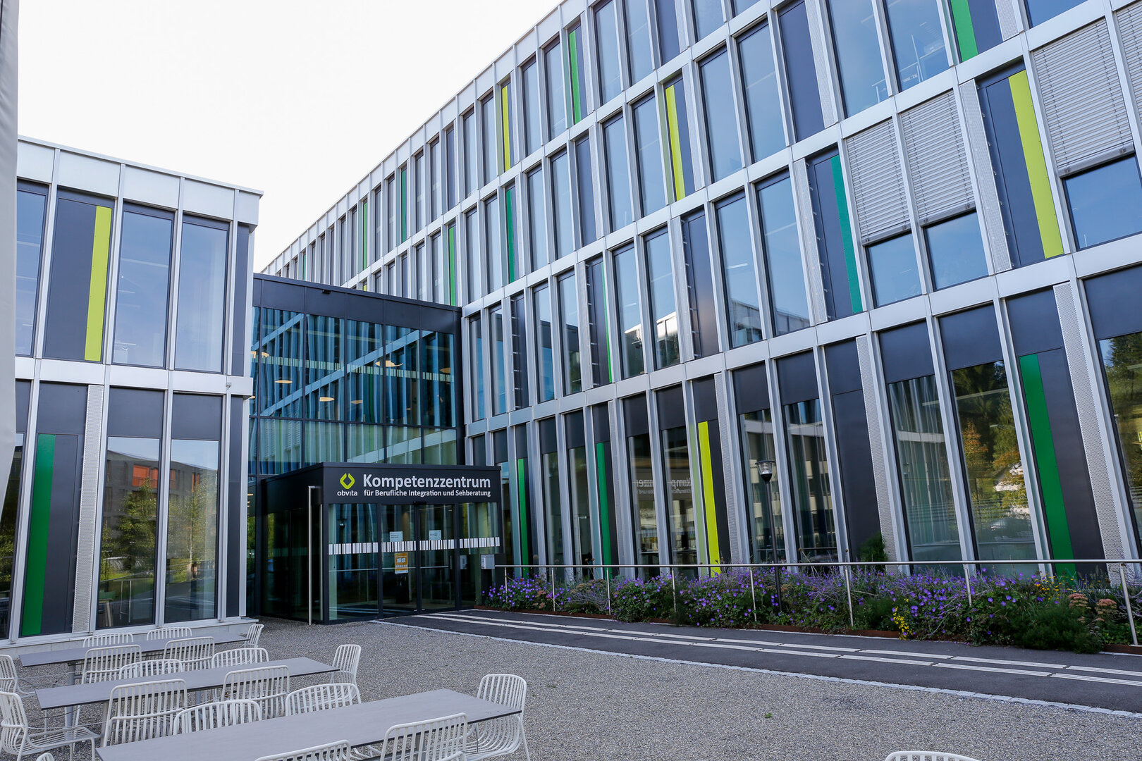 Zwischen dem neuen Zentrumsbau und dem ehemaligen Blindenheim entsteht eine Parkanlage mit Bäumen, Wegen und Plätzen die zum Verweilen einladen. Die Parkanlage bindet die angrenzenden Bauten und schafft respektvolle Distanz zwischen dem ehrwürdigen Altbau und dem Neubau der obvita.