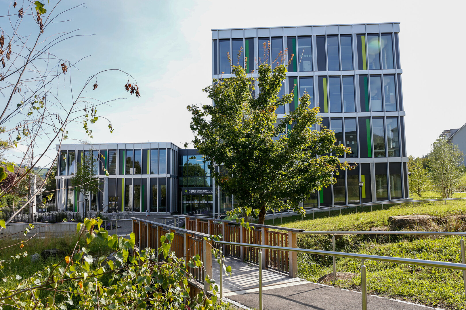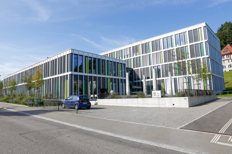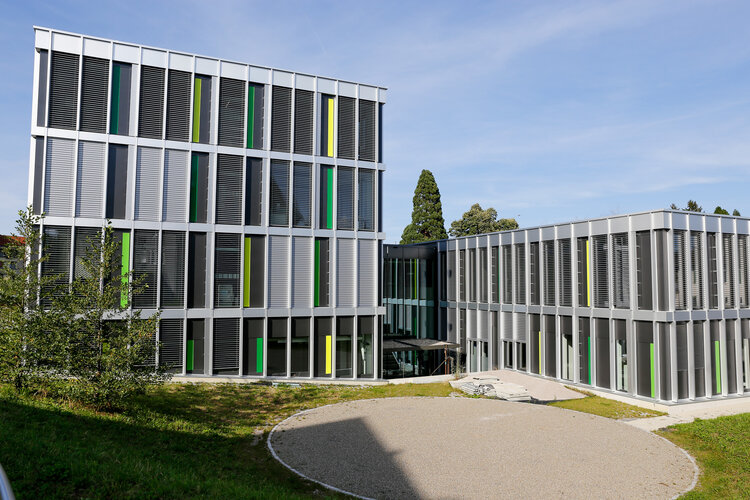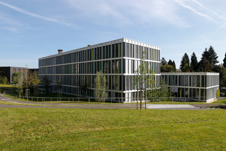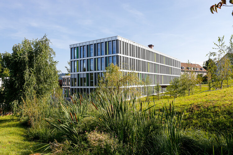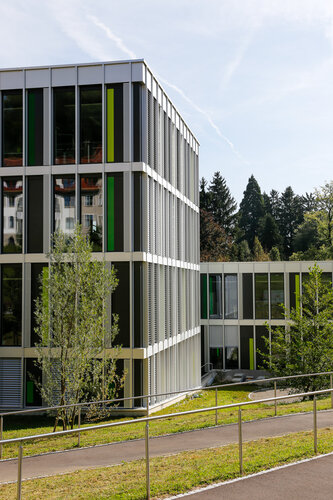 Die Formensprache reduziert sich auf Sockel und Fassade. Der Sockel ist in Beton, die Fassade in Metall und Glas gehalten. Vertikale Profile, farbige Paneele, Lüftungsgitter, Verglasungen und Festelemente tragen einerseits zum homogenen Erscheinungsbild bei und lassen die Fassade andererseits verspielt wirken. Dazu kommen wesentliche Elemente der Freiraumgestaltung, wie die Piazza mit raumbildenden Baumkronen und dem Haupteingang.
