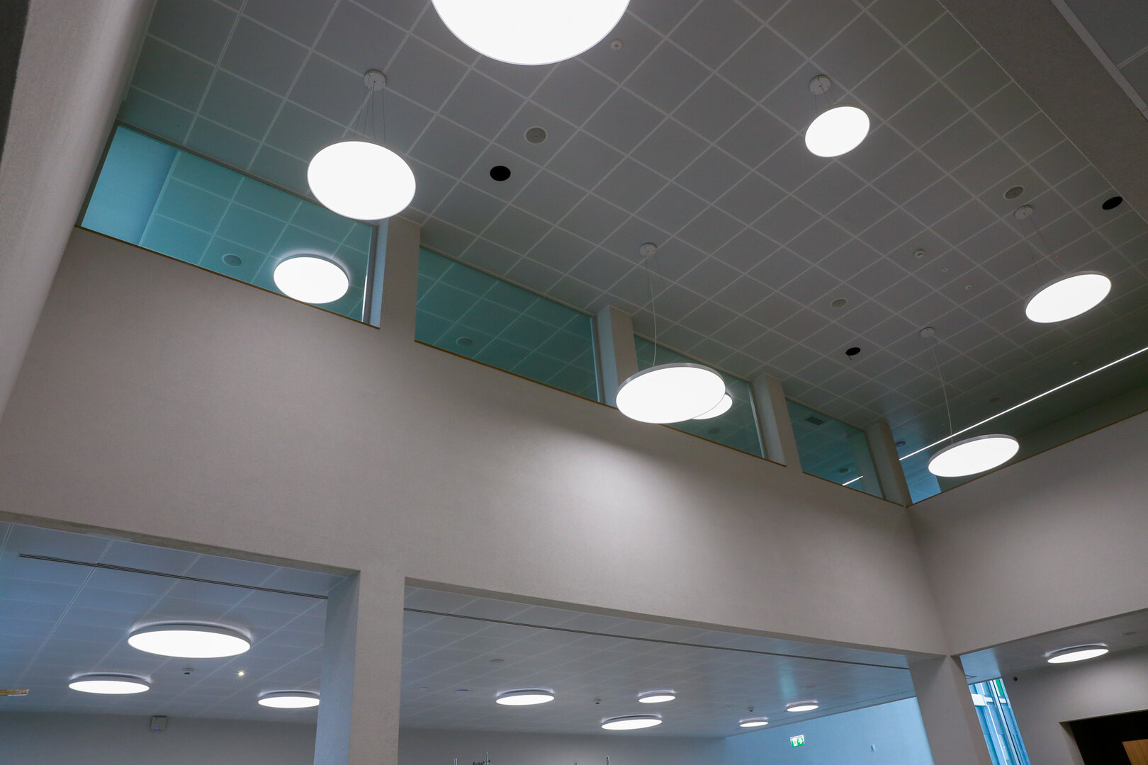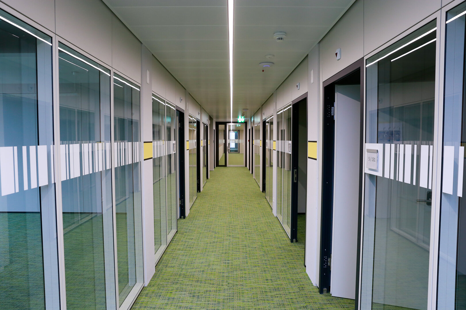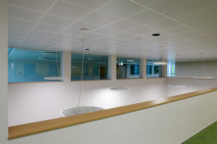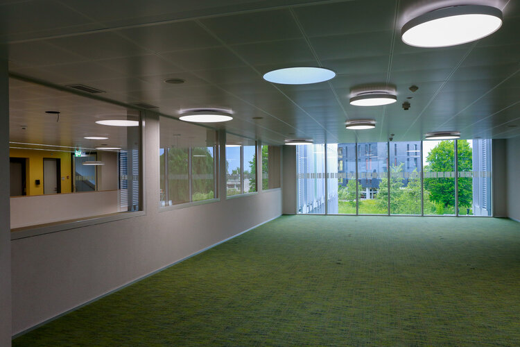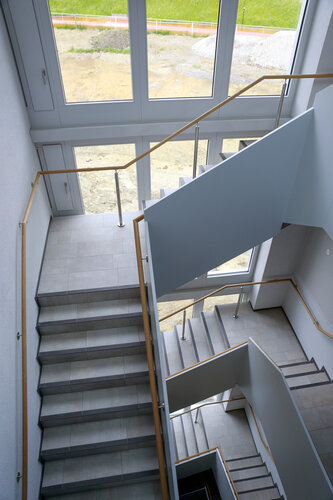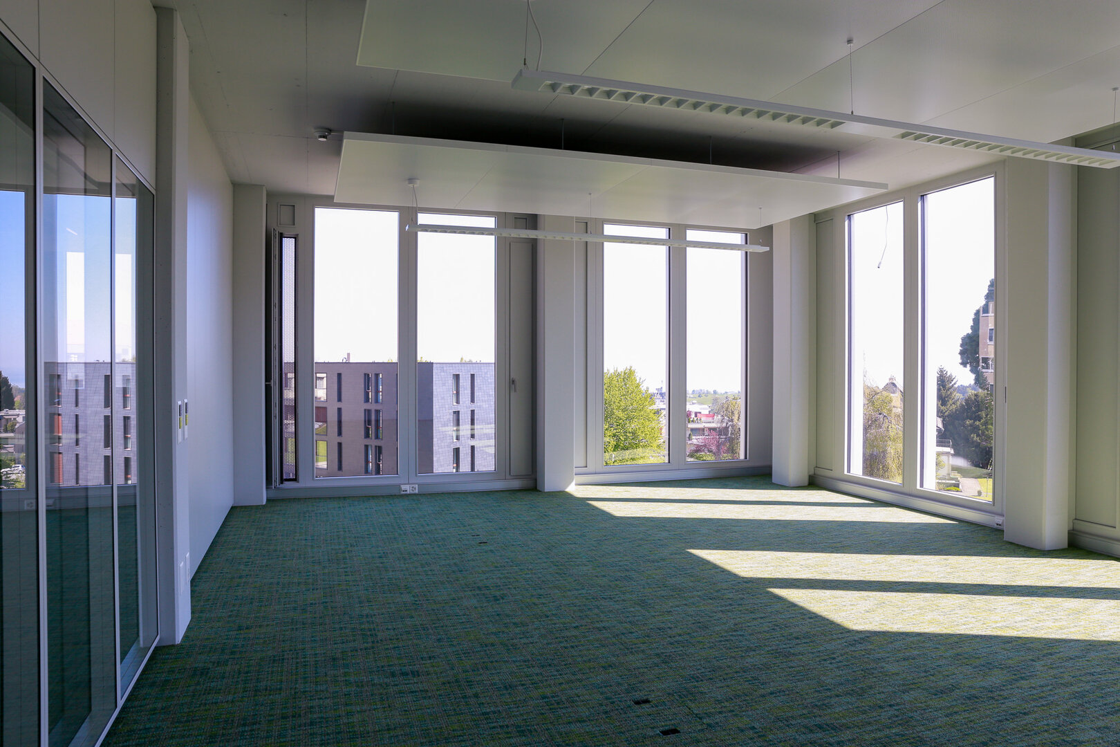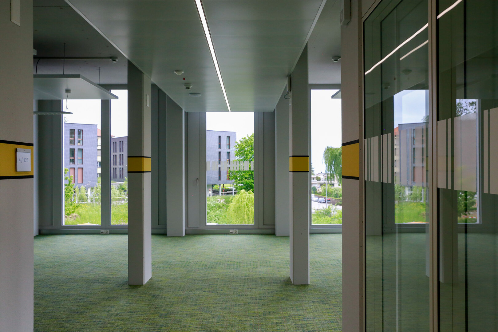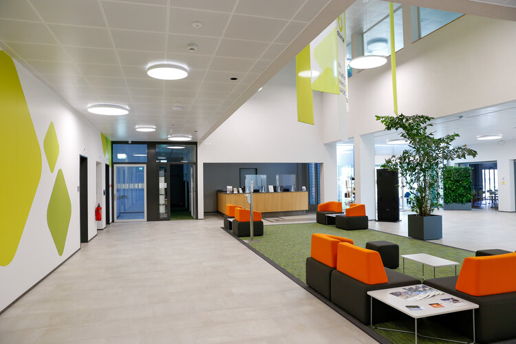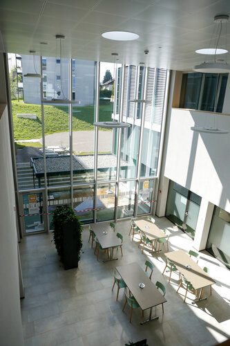 Über den Haupteingang auf der Piazza gelangt man in die Eingangshalle. Diese soll das Entwurfskonzept der Innenräume verdeutlichen. Die Halle ist in mehreren Bereichen zweigeschossig gehalten, Material- und Formensprache werden auf das notwendige reduziert und die mehrschichtigen Raumfolgen sollen für den Besucher spürbar gemacht werden. So entsprechen sich Äusseres und Inneres. Das Gebäude erscheint als einheitliche Komposition von zwei Baukörpern, die sich auf das Wesentliche konzentrieren.